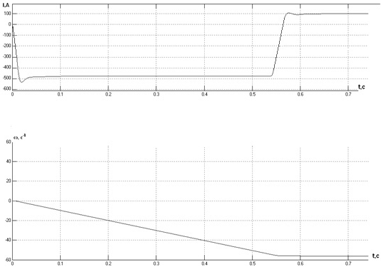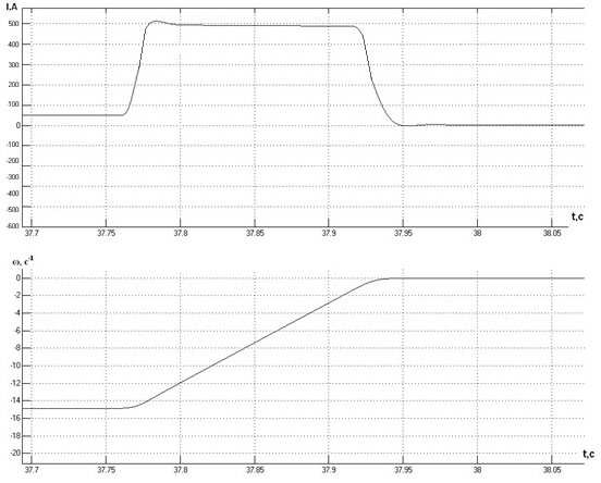 Рисунок 6.12 - Графики I = f(t) и = f(t) во время торможения.