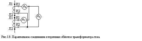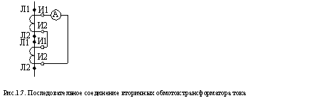 При большой вторичной нагрузке трансформатора тока может не обеспечиваться требуемый класс точности. В этом случае последовательно включаются первичные и вторичные обмотки двух трансформаторов тока, установленные на одной фазе. Величина вторичного тока остаётся неизменной (рис.1.7).