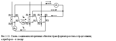 Схема соединений вторичных обмоток трансформаторов тока в треугольник, а приборов в звезду показана на рис.1.11. В приборе А1 протекает ток, равный геометрической разности токов в фазах А и В.