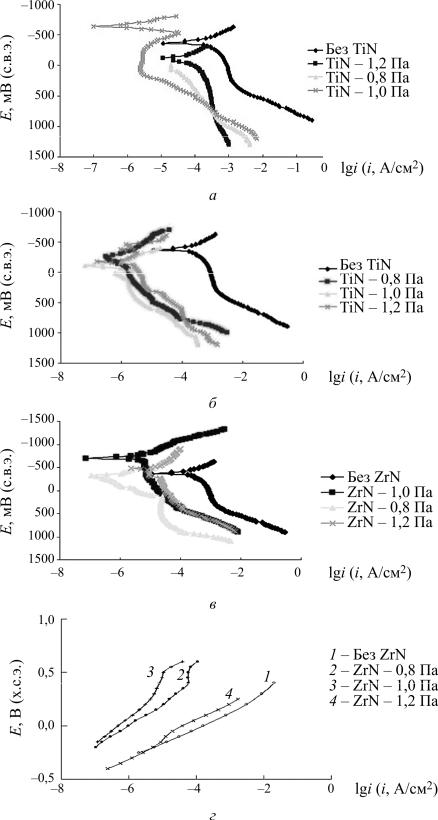 Рис. 3.9. Поляризационные кривые образца из ВК8 с многослойными пленками со слоями: TiN (а, б) и ZrN (в, г), сформированными при различном давлении методами МР (а, в) и ЭДИ (б, г).