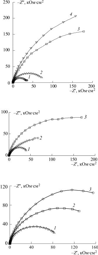 Рис. 3.11. Графики Найквиста в 3 % NaCl при потенциале коррозии. Номера пленок: 1 – 1; 2 – 2; 3 – 4; 4 – 3