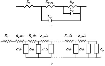 никновения переменного тока, используемого при измерениях импеданса, в поры с электропроводными стенками зависит от частоты переменного тока, и в общем случае импеданс пористых электродов описывается трансмиссионной линией [93, 94], возможный вид которой показан на рис. 3.14, б (в предположении, что удельное сопротивление материала электрода существенно меньше удельного сопротивления раствора в порах). Здесь Re – сопротивление раствора в поре на очень малом по длине участке dх поры, Z – импеданс границы стенка поры/раствор на участке dх, Zb – оконечный импеданс [94], который в данном случае может представлять собой нераспределенный импеданс дна поры. Импеданс пористых электродов существенно зависит от отношения l/r, где l – длина пор, r – их радиус [93]. При l/r >> 1 наблюдается поведение трансмиссионной линии, которому отвечает появление прямолинейных участков с наклоном ~45° на графиках Найквиста в области высоких частот [93]. При l/r << 1 (короткие и широкие поры) электрод ведет себя как плоская поверхность [93].
