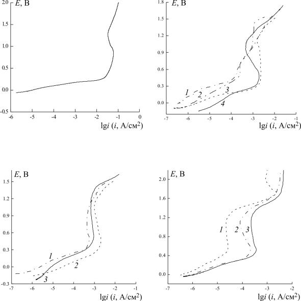 Анодная потенциодинамическая кривая для подложки приведена на рис. 3.15, а поляризационные кривые для образцов с пленками – на рис. 3.16–3.18. В табл. 3.11 даны полученные из поляризационных кривых характеристики, такие как тафелевский наклон анодной поляризационной кривой ba (на анодных поляризационных кривых обычно можно выделить более одного тафелевского участка; в качестве ba приводится значение наклона участка более близкого к Екор), потенциал начала пассивации Eп, критическая плотность тока iкр, плотность тока в области пассивного состояния iп, потенциал перепассивации Eпп, а также разность (Eпп – Eп).