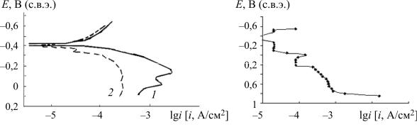 плотности тока 3 мА/см2, затем падает (см. рис. 3.27, а, кривая 1). Рост анодного тока в щелочных растворах связан с селективным растворением зерен WC. Кривая 2 (см. рис. 3.27) представляет поляризационную кривую образца ВК8 c осажденным Ti1–хAlхN слоем. Установлено, что сформированный Ti1–хAlхN слой не влияет на потенциал свободной коррозии Екор, который как и на образце без упрочнения близок к –0,4 В; а также не влияет на кинетику восстановления кислорода (катодные участки кривых 1 и 2 практически совпадают). Анодный ток достигает предельного значения при потенциале –60 мВ, выше которого начинается переход в пассивное состояние. Сравнение токов при одинаковом потенциале –0,2 В кривых 1 и 2 на рис. 3.27, а показывает, что Ti1–хAlхN слой существенно тормозит процесс анодного растворения. Скорость растворения при потенциале –0,2 В уменьшается примерно в 18 раз.