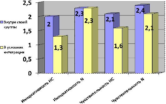 Как видно из диаграммы (рисунок 3), средние баллы оценки взаимодействия детей с нарушенным слухом в условиях совместной со слышащими сверстниками деятельности заметно ниже, чем при общении с детьми своего класса, что говорит о трудностях при включении в новый детский коллектив.