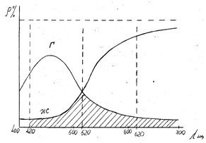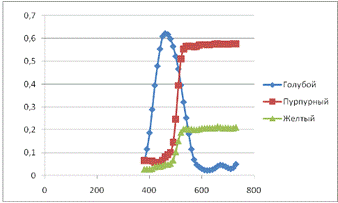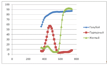 На следующем этапе наших исследований производились расчеты относительных площадей растровых элементов при известных значениях спектральных коэффициентов отражения (по трем избранным длинам волн) для избранного образца. В качестве такого образца мы должны были бы выбрать любой цветной оригинал. Однако, это связано с нашими производственными возможностями, которые очень ограничены временем дипломной работы, так как после определения значения площадей для желтой, голубой и пурпурной красок нас потребовалось бы изготовить фотоформу, форму и произвести печать. Поскольку такой возможности мы не имеем, то поэтому мы выбрали другую методику.