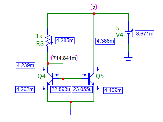 Работа токового зеркала «программируется» путем задания коллекторного тока транзистора Q4. Напряжение Uбэ для Q4 устанавливается в соответствии с заданным током, температурой окружающей среды и типом транзистора. В результате оказывается заданным режим схемы, и транзистор Q5, согласованный с транзистором Q4 (лучше всего использовать монолитный сдвоенный транзистор), передает в нагрузку такой же ток, что задан для Q4. Небольшими базовыми токами можно пренебречь.