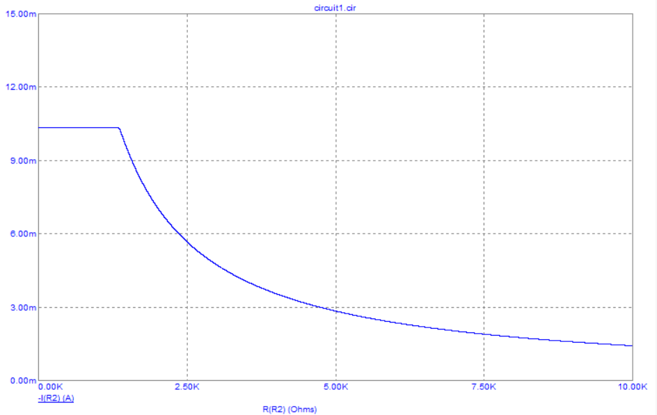 Рисунок 6. График зависимости тока от сопротивления нагрузки, построенный в MicroCap