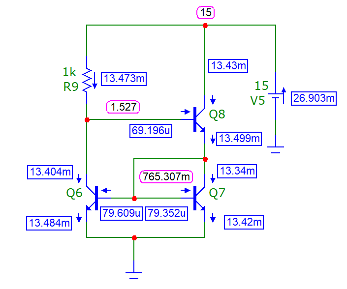 Транзисторы Q6 и Q7 включены как в обычном токовом зеркале. Благодаря транзистору Q8 потенциал коллектора транзистора Q6 фиксирован и на удвоенную величину падения напряжения на диоде больше, чем напряжение земли. Такое включение позволяет подавить эффект Эрли в транзисторе Q6, коллектор которого теперь служит для задания режима работы схемы; выходной ток определяется транзистором Q7. Транзистор Q8 не влияет на баланс токов, если его базовый ток пренебрежимо мал; его единственная функция состоит в том, чтобы зафиксировать потенциал коллектора Q6. В результате в токозадающих транзисторах Q6 и Q7 падения напряжения на эмиттерных переходах фиксированы; транзистор Q8 можно рассматривать как элемент, который просто передает выходной ток в нагрузку, напряжение на которой является переменным (аналогичный прием используют при каскодном включении). Транзистор Q8 не обязательно согласовывать с транзисторами Q6 и Q7.