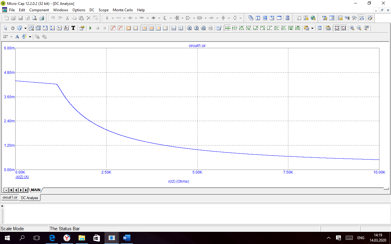 Рисунок 14. График зависимости тока от сопротивления нагрузки, построенный в MicroCap