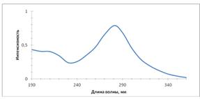 В УФ-спектре наблюдается пик при длине волны 281 нм с величиной
