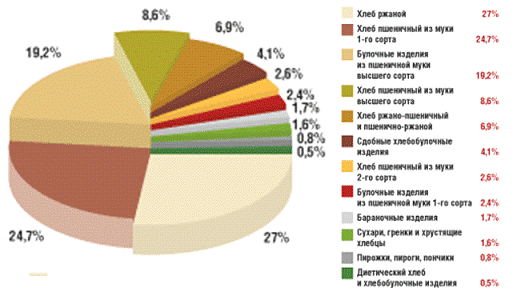 В целом российский рынок хлеба и хлебобулочных изделий в натуральном выражении условно разделяется на два сегмента: первый включает в себя хлеб из пшеничной, ржаной муки и из смеси разных сортов муки, второй - хлебобулочные изделия. По состоянию на 2011 год доля сегмента хлеба из пшеничной и ржаной муки и из смеси разных сортов составила чуть более 70%; доля же сегмента хлебобулочных изделий была на уровне 30% общего объема рынка.