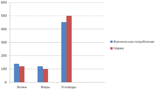 1 - сравнение между фактическим потреблением белков, жиров и углеводов и их