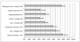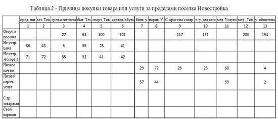 Сравнивая ряды данных рисунка 5 можно заметить, что жители хоть и приобретают продукты питания в поселке (166 человек), но почти все из них так же делают покупки и вне данного поселка (141 человек), так как их либо не устраивает цена, либо ассортимент (таблица 2), то есть разница составляет всего лишь 25 человек, значит всего лишь 15% от людей приобретающих продукты питания делают это только в поселке Новостройка. Что касается хозяйственных товаров, то прослеживается тенденция аналогичная продуктам питания (140 человек приобретают товар в поселке и 126 - вне поселка, с разницей в пятнадцать человек и 10,7%), но спрос на хозяйственные товары отличается от спроса на средства гигиены, где 154 респондента делают покупку вне данного населенного пункта, так как 85 человек не устраивает ассортимент и 27 респондентов не знают о наличии такого товара в поселке (таблица 2), и 67-переодически приобретают средства гигиены в поселке, что составляет 43,5% от 154 человек.