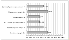 Что касается парикмахерских услуг, можно заметить, что около четверти опрощенных (53 жителя) пользуются парикмахерскими услугами внутри поселка, ещё 133 человека предпочитают эту услугу за пределами поселка, что объясняют низким качеством 72 человека и 44 - низким перечнем услуг(табл. 2).