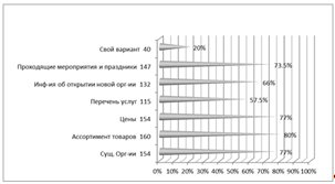 Из рисунка 10 видно, что 80% опрошенных жителей хотят видеть на сайте ассортимент товаров, 77% или 154 человека - существующие организации и цены. Остальные варианты ответа выбрали больше 50% опрошенных: