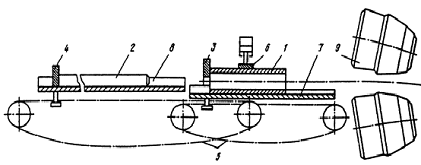 - гильза; 2 - оправка; 3 - толкающая тележка для гильзы; 4 - тележка для оправок; 5 - привод тележек; 6 - пневмоприжим; 7 - желоб гильз; 8 - желоб оправок; 9 - рабочие валки