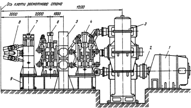 - двигатель главного привода; 2 - муфта; 3 - шестеренная клеть; 4,6 -центрователи; 5,7 - устройство выдачи трубы и оправки из стана; 8 - шпиндели главного привода; 9 - рама