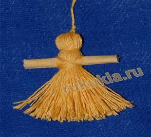 Куклу вяжут из обрывков разноцветных шерстяных нитей, используя картон для подготовительных операций и целую сухую горошину в качестве основы. Сегодня шерстяную пряжу можно заменить нитками "ирис", мулине и им подобными.