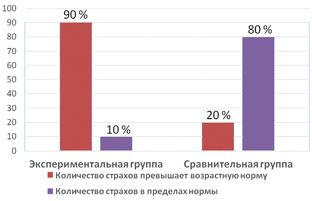 Иная картина наблюдается при изучении страхов у детей, уровень страхов которых превышает возрастную норму, по большей части экспериментальной группы.