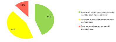 Численность педагогических работников, которым по результатам аттестации присвоена квалификационная категория, в общей численности педагогических работников - 24 чел. (88%). В том числе высшая квалификационная категория присвоена 12 чел. (44%), первая квалификационная категория - 12 чел. (44%).