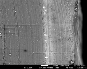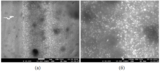 Структурную упорядоченность полученных нанокомпозитных полимерных материалов изучали методами растровой электронной микроскопии (РЭМ). Для этого изоготовляли торцевой срез полимера. Для изготовления торцевого среза полимер вначале замораживали в жидком азоте, а потом аккуратно отламывали ножом необходимую часть. Исследование проводили на растровом электронном микроскопе JEOL JSM-7500F в режиме отраженных электронов (COMPO). Для каждого образца получали изображения торцевого среза с различным увеличением от 1 000 до 50 000 раз. На рисунке 15 приведено изображение образца нанокомпозитного материала в небольшом увеличении, который вымачивался в растворе хлорида кобальта концентрацией 0,1 моль/л.