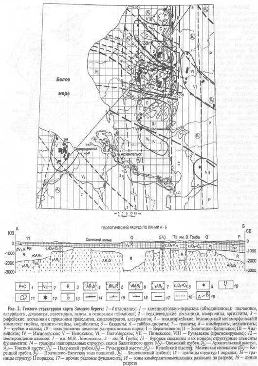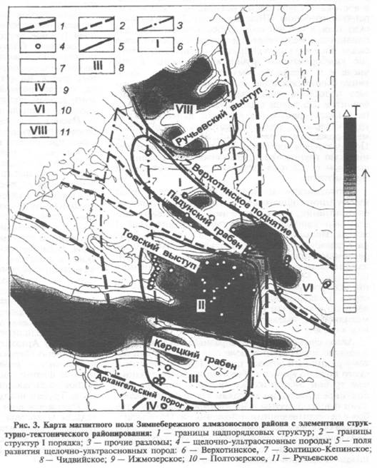 Зимнебережный единственный район в Архангельской области с установленной промышленной алмазоносностью. Здесь кроме двух коренных месторождений алмазов известны более 90 различных по составу трубок взрыва, силлов и даек. Высокая перспективность Зимне-бережного алмазоносного района требует более детального подхода к ранжированию его территории с выделением более мелких минерагенических таксонов в ранге рудных полей. Существует несколько схем районирования Зимнебережного алмазоносного района, но наиболее распространена схема, предложенная коллективом авторов ГП «Архангельскгеология» при разработке «Программы геологоразведочных работ на алмазы в ААП на 1992-2000 гг.», с незначительными изменениями приведенная в [2]. Эта и другие схемы объединяют в поля щелочно-ультраосновных пород магматические тела по их пространственному размещению и в какой-то мере по составу, что не учитывает главный фактор районирования - тектоническую приуроченность трубок к тем или иным структурам фундамента.