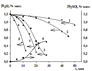 расходования сульфидов и кинетическая кривая накопления сульфоксидов (6). [R2S]0 = 1.2 %