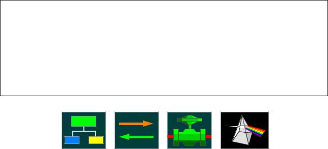 Взону Структура интерфейса и группы Схема потоков, Клапанные сборки...,Составы потоков можно быстро перейти из зоны или группы, минуя кадр Обзор. Для этого нужно щелкнуть мышью по одному из переходов в виде квадратной иконки, которая размещена обычно в верхней части кадра, вблизи названия зоны или группы. На иконке перехода в зону Структура интерфейса изображены 3 разноцветных прямоугольника (зеленый, синий, желтый – рис. 7а), на иконке перехода в группу Схема потоков – 2 стрелки (оранжевая и зеленая рис. 7б), на иконке перехода в группу Клапанные сборки ..) – клапан (рис. 7в), а на иконке перехода в группу Составы потоков – анализатор (рис. 7г).