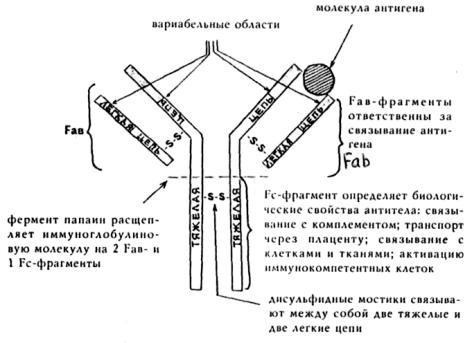 Для понимания механизма действия антител необходимо рассмотреть их структуру (см. рис.3). Молекула антитела напоминает букву Y и состоит из двух тяжелых и двух легких цепей, связанных между собой дисульфидными мостиками. И тяжелые, и легкие цепи идентичны и симметрично расположены. Фермент папаин расщепляет молекулу антитела на два одинаковых Fab-фрагмента (fragment, antigen binding, сокращенно Fab) и Fc-
