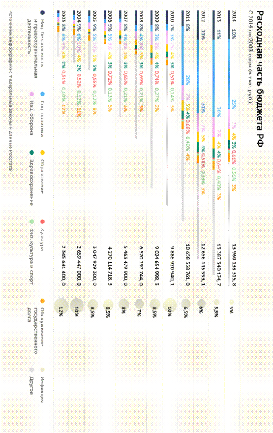 На протяжении всего десятилетия правительство наращивало расходы практически по всем направлениям. Наиболее разительное исключение составляет обслуживание госдолга, на который в 2003 году пришлось почти 12 процентов от всего количества расходов. Уже к 2005 году этот показатель упал до восьми процентов, а абсолютный минимум на уровне двух процентов был достигнут по итогам 2009 года. Объясняется такой феномен довольно просто: в условиях высоких цен на нефть Россия сумела досрочно оплатить долги советского времени и 1990-х годов, в том числе 21 миллиард долларов Парижскому клубу кредиторов в 2007 году. После начала мирового финансового кризиса выплаты по долгам вновь начали нарастать, в проекте бюджета на 2014 год на эти цели выделяется уже 452 миллиарда рублей, или 3,2 процента от всех расходов.