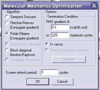 Затем compute-geometry optimization-OK. При сравнительно небольших молекулах число циклов можно не менять, оставив значение по умолчанию, которое предлагает программа.
