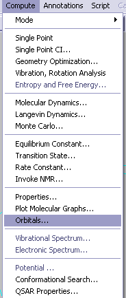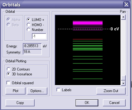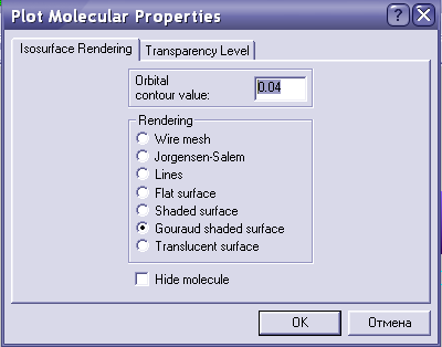 Теперь переходим к построению МО. В меню compute—orbitals появляется следующее окошко. Вводя номер ВЗМО и НСМО(по очереди) можно посмотреть их энергию, а нажав кнопку plot ---ОК можно построить изображение МО на вашей молекуле. Если видно плохо, поменяйте RENDERINGS или нажмите F4 и выбирете парметры для 3d-графика(wire mesh и contour value).