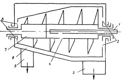- труба для подачи осадка; 2 - отверстия для выгрузки фугата; 3 - бункер для выгрузки фугата; 4 - отверстие для поступления осадка в ротор; 5 - бункер для выгрузки кека; 6 - ротор; 7 - полый шнек; 8 - отверстия для выгрузки кека.