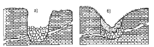Рис.3. Перетворення колодязеподібного циліндричного провалу а) на лійкоподібну западину б). Рис. взятий із «Стецюк В. В., Ковальчук І. П. Основи геоморфології, Київ. 2005»