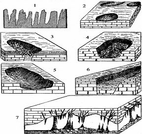 - кари; 2, 3 - воронки поверхневого