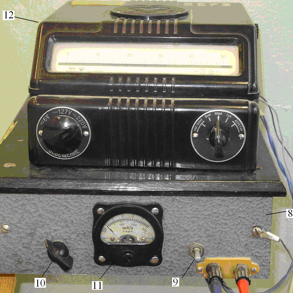 Блок включения фотоэлемента представлен на рис. 2.1.в) Источник питания фотоэлемента заключен в металлический кожух (8), на лицевой панели которого размещены тумблер (9), замыкающий цепь питания фотоэлемента, рукоятка потенциометра (10) для изменения напряжения на электродах фотоэлемента, а также головка вольтметра (11). Вверху на стойке закреплен гальванометр (12) для измерения фототока.