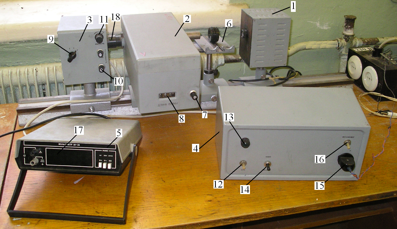 Источник излучения 1 и приёмник излучения 3 подключаются к блоку питания 4. На лицевой панели блока питания имеется тумблер «СЕТЬ» 12, сигнальная лампа 13, тумблер «НАКАЛ – НЕДОКАЛ» 14, обеспечивающий работу источника излучения в двух режимах, гнездо 15 для подключения цифрового вольтметра 5 и тумблер 16 для включения фотоэлемента.