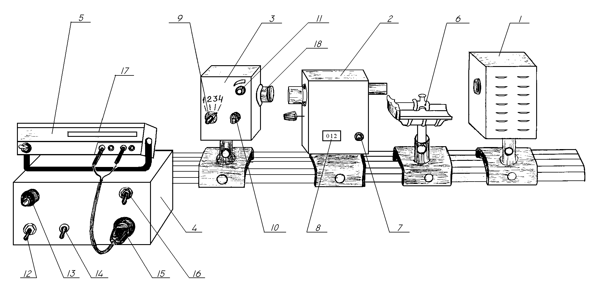 Для излучения молекулярных спектров поглощения в работе используется универсальный малогабаритный монохроматор МУМ. Установка приведена на рис. 2.1 и включает в себя источник излучения 1, монохроматор 2, приёмник излучения 3, блок питания источника и приёмника излучения 4, цифровой вольтметр В7-22А 5, столик, на котором в держателях крепятся кюветы с исследуемой жидкостью 6.