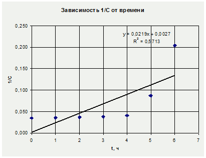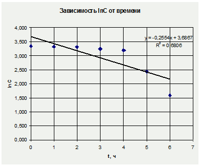 Порядок реакции определяем графическим методом: стороим зависимости lnC=f(t), 1/C= f(t), и lg[-ln(1-α)] = f(lgt) и обрабатываем уравнения прямых. Для этого рассчитываем коэффициенты линейной зависимости и коэффициенты достоверности аппроксимации R2.
