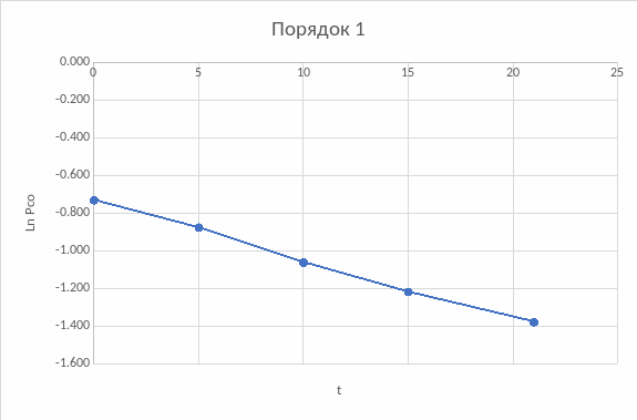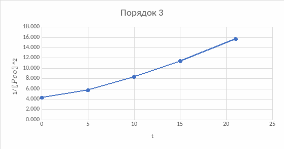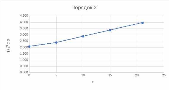 График, соответствующий второму порядку, имеет наиболее прямую линию из всех. Следовательно порядок реакции второй.