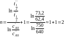 Решение: Данная задача на нахождение порядка реакции. Для её решения воспользуемся методом Оствальда-Нойесса. Так как данных немного, и особого смысла строить график по двум точкам нет, стоит использовать аналитический способ. Уравнение для расчёта порядка реакции по методу Оствальда-Нойесса по данным о времени полупревращения в двух опытах выглядит следующим образом: