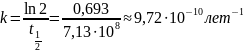 Решение: Стоит отметить, что с исключительной точностью подчиняются уравнению для реакций первого порядка все процессы радиоактивного распада. Поэтому и распад 235урана будет реакцией первого порядка. Отсюда можно написать уравнение для периода полураспада (или времени полупревращения) реакции первого порядка: