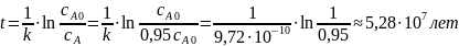Исходя из уравнения для константы скорости, можно рассчитать за какое время содержание 235урана в образце уменьшится на 5 %: