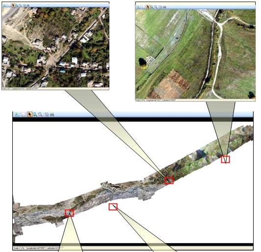 В результате площадной или протяженной съемки образуется массив фотоснимков высокого разрешения. Каждый фотоснимок имеет координатную привязку по данным навигационной системы БЛА и данные по углам ориентации БЛА в момент производства снимка. Оригинальное ПО позволяет в кратчайший срок после поступления массива снимков в компьютер НПУ произвести в автоматическом режиме: