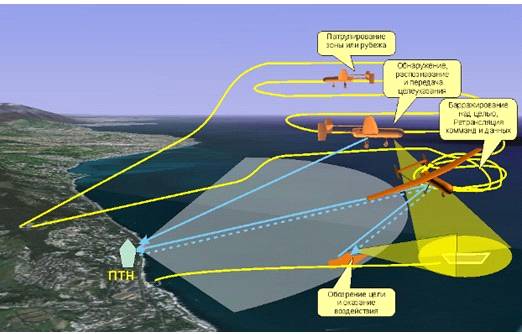 · совершающий разведывательный полет БЛА обнаруживает цель и по каналу связи с ПТН передает ее координаты на пост управления;