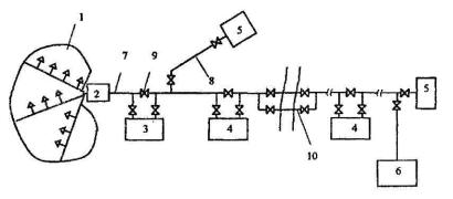 1 - газосборные сети; 2 - промысловый пункт сбора газа; 3 — головные сооружения; 4 - компрессорная станция; 5 - газораспределительная станция; 6 - подземные хранилища; 7 - магистральный трубопровод; 8 - ответвления от магистрального трубопровода; 9 - линейная арматура; 10 - двухниточный проход через водную преграду