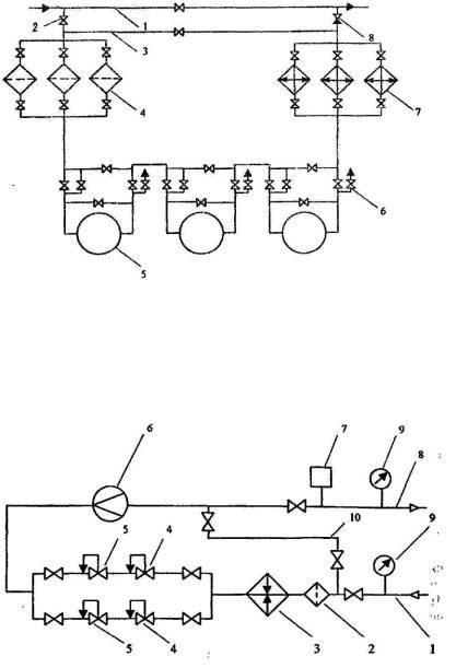 1- магистральный газопровод; 2 - кран; 3 - байпасная линия; 4 - пылеуловители; 5 - газоперекачивающий агрегат; 6 - продувные свечи; 7 - АВО газа; 8 - обратный клапан
