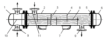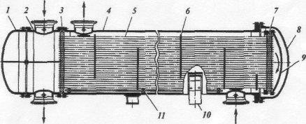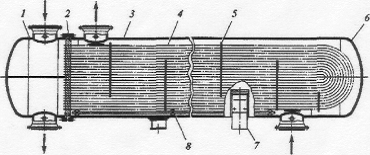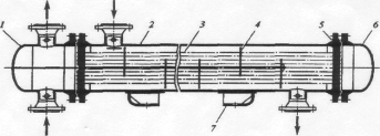 - теплообменная труба; 5 - поперечная перегородка; 6 - крышка кожуха; 7 -