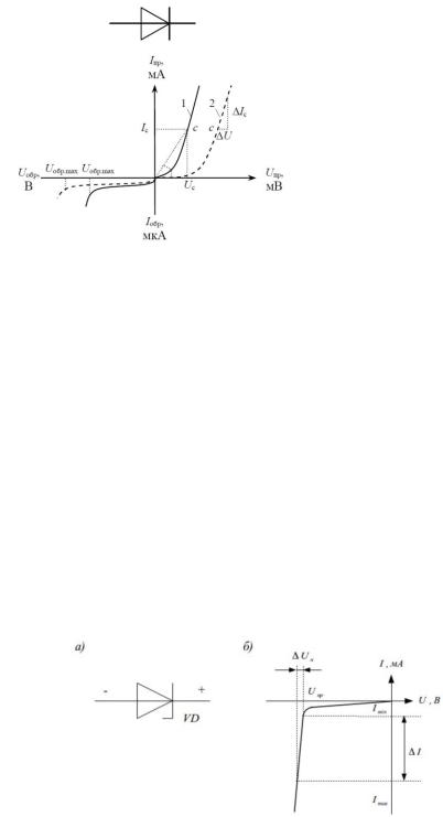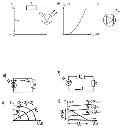 из зоны проводимости в валентную зону. Это сопровождается излучением кванта энергии. При определенном подборе материала, из которого изготавливается диод, излучаемая оптическая энергия может находиться в видимой части спектра. Исходным материалом для изготовления светодиода служат фосфид галлия, арсенид-фосфид галлия, карбид кремния. Большую часть энергии, выделенной в этих материалах при рекомбинации носителей заряда, составляет тепловая энергия. На долю энергии видимого излучения приходится порядка 10-20 %, поэтому кпд светодиода не велик. Светодиоды применяются в качестве световых индикаторов. Конструкция диода обеспечивает передачу света от p-nперехода без значительных потерь в теле полупроводника. Светодиод работает при подаче напряжения в прямом направлении. Схема включения, ВАХ и условное обозначение светодиода показаны на рис 1.5.